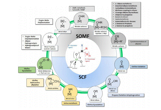 Both types of fragments were identified within SOMC as it allows the isolation of single-site well-defined heterogeneous catalyst. SOMC can generate catalytic sites that are in principle identical (single-site or single atom) by grafting transition metal atoms onto highly dehydroxylated metal oxide support handled under controlled atmosphere. This strategy presents considerable advantages over traditional heterogeneous catalysts in which various populations of metallic potentially active sites coexist.