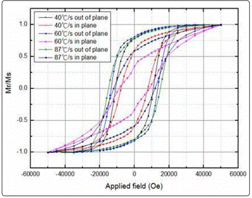 Figure 3 showed magnetization curves of the samples annealed with different RTA heating rates. With increasing heating rate, both the in plane and out of plane coercivities increased. This can be due to the reason that larger in-plane tensile-stress was induced by larger heating rate. Therefore, more defects were produced to be pinning sites, which can pin the domain walls and, therefore, the coecivity was increased [16].