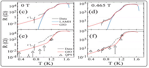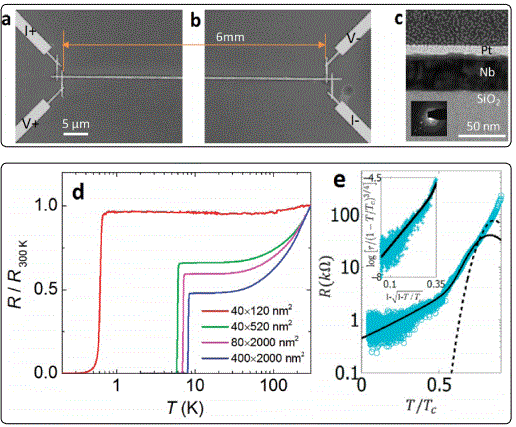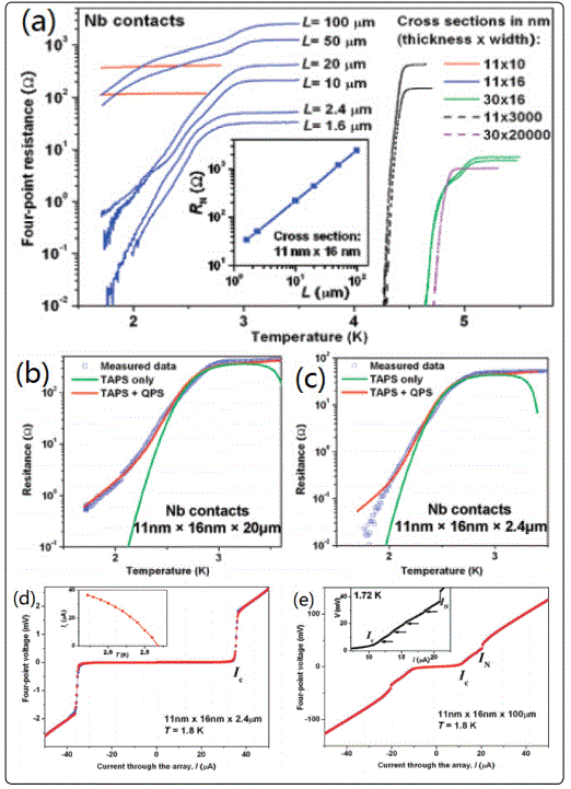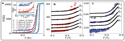 The Nb nanowires of 6 mm long with different cross-sectional dimensions (shown in Figure 4a,b) were fabricated using standard e-beam lithography processes [34]. A low-temperature residual resistance tail measured with an excitation current of 5 nA was found in the thinnest wire down to 50 mK or 7.7% of Tc of Nb (shown Figure 4d, e). The functional form of the residual resistance was consistent with quantum phase slip (QPS) processes and was well described by eq 1 as proposed by Giordano [11]. According to eq 1, authors defined y=r/(1-T/Tc)3/4and x=1-, a plot of log(y) versus x in the low temperature regime should be a straight line if the measured resistance is dominated by QPS. The inset of Figure 4e confirmed this expectation. Moreover, resistance measured at high bias excitation current switched among many discrete values that were well below the normal state resistance. These discrete resistance values as a function of temperature falled into several parallel curves (shown Figure 5) all showing QPS-like decay in the low temperature limit similar to that found at low current. This phenomenon was not observed in the previous QPS experiments in micron long nanowires with either low or high currents and constitutes the key new result of Zhaoʼs work. They quantified the length of the phase slip centers, which at about 40 μm was longer than the nanowires used in prior phase slip experiments but much shorter than their NbNW. The latter condition leaded to a situation that sections of the wire near phase slip centers turned normal while regions far from the phase slip centers stayed in superconducting phase and exhibited QPS-like temperature dependence in the low temperature limit similar to that found with low excitation current.