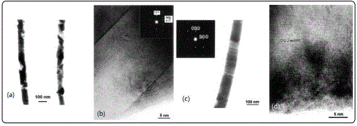 Lead nanowires with high aspect ratio and diameter from 40 to 270 nm have been grown by electrodeposition inside nanoporous polycarbonate membranes [50]. The thinner Pb nanowires were found to be polycrystal with good quality single-crystal regions extending over several microns(asshown in Figure7a and b), and Figure 7c and d revealed the Pb nanowires with 95 nm in diameter appear to have a monocrystalline fcc structure. For small nanowires diamet er (56 nm), Ginzburg–Landau theory [51] allowed one to deduce that vortices did not penetrate nanowires. In contrast, for large nanowire diameter (270 nm), it was shown that one vortex likely penetrated the nanowires at low temperature.