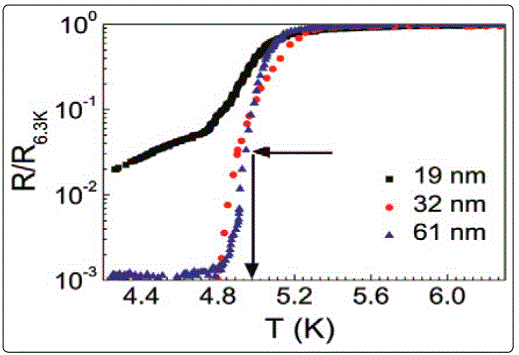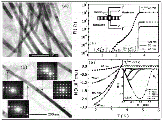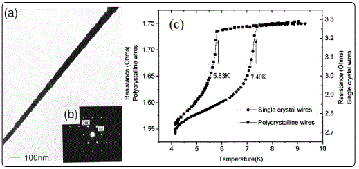 Single crystal superconducting Pb wires (diameter~50 nm) (Figure 9a) prepared by pulse electrode position innanoporous membranes [21] showed significantly higher superconducting transition temperature Tc than that of polycrystalline ones (Figure 9b). The author attributed this to the possible reasons: