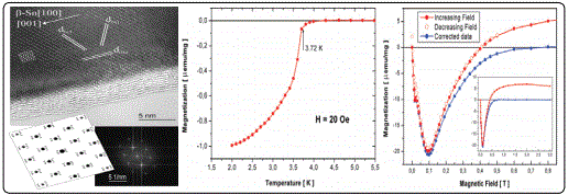A noncatalytic and template-free vapour transport process has been employed to prepare s ingle-crystalline Sn nanowires with diameters of 10-20nm [73]. The superconducting transition temperatures for Sn nanowires was about 3.7 K, which was very close to that of bulk β-Sn. Magnetization measurements showed that the critical magnetic fields for both Sn nanowires increased significantly as compared to that of bulk Sn Figure 12B.
