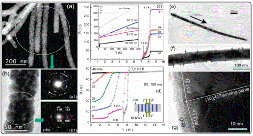 To further explores the transport properties of individual single-crystalline Bi nanowires, Tian et al. synthesized ultrathin Bi nanowires of 20 and 32 nm diameters(Figure 16a and b). Compared with 72 nm Bi wire,the superconducting transition at 1.3 K was seen in both 20 and 32 nm cylindrical nanowires, but the 0.67 K phase observed in 72 nm wire did not appear (shown in Figure 16c). However, their superconducting critical magnetic fields decreased with their diameter, which is the opposite of the expected behavior for thin superconducting wires. Quasiperiodic oscillations of magneto resistance were observed in perpendicular fields but were not seen in the parallel orientation. This result is also consistent with the observation of superconductivity of Bi confined in an opal host without surface oxidation [96]. The superconductivity in cylindrical nanowires or particles is most likely related to the surface curvature-induced stress in the nanowires or nanoparticles. Such stress will give rise to considerable distortion or disordering in the surface states of the cylindrical nanowires.