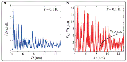 Figure 24a showed the calculated critical current density as a function of the nanowire diameter. This result showed that quantum-size effects play a very important role in the size-dependent increase of the critical current. Real samples exhibit inevitable cross-section fluctuations that will smooth those quantum-size oscillations in the critical current. Figure 24b displayed the critical superfluid velocity vscas a function of the wire diameter. This quantity defined as the velocity at which complete destruction of the condensate occurs exhibits the same trend.