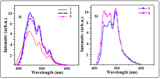 We explained the synthesis properties of ZnS:Co samples. In contrast the trap states are located within the semiconductor band gap and hence their emission is usually red-shifted relative to the band edge emission. In addition, the trap state luminescence is often characterized by a large band width reflecting abroad energy distribution of the emitting states. Nonradiative decay pathways associated with unpassivated surface atoms competed with radiative exciton recombination. The characteristic luminescence can consist of relatively sharp emission bands (spectral width typically a few nm), but also of broad bands, whose width can exceed 50 nm in the visible part of the spectrum. Sharp emission bands are characteristic of optical transitions between electronic states with chemical bonding character (almost) the same for ground and excited states that hardly participate in the chemical bonding. These activities in the host material define the luminescence efficiency and can produce a narrowing or broadening of the band width of the spectra. As shown in all figures, we have three peaks that can correspond to band edge, shallow traps, and deep traps. Figure 4 shows the PL spectra and absorption spectra of a series of samples with different doping concentration. The PL spectra (Figure 4a) of the nanocrystal samples show three peaks, at 444, 478, and 530 nm,which are attributed to the band edge, shallow and deep traps, respectively. We see that undoped nanocrystals have a narrower size distribution than the 5% and 10% doping nanocrystals.