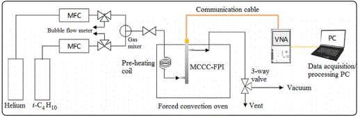 The experimental measurement system is schematically illustrated in Figure 5. One end of the MCCC-FPI cable was connected to a vector network analyzer (N9923A RF VNA; Keysight Technologies, Eaglewood, CO, USA) through a communication coaxial cable and the other end was sealed with a short-circuit-terminator. The FPI sensor was hosted in a temperature programable forced covection oven and the sample chamber was connected to the gas supply on one end and the exiting port was connected to a 3-way valve, which could switch between the normal ventilation and the vacuum pump. The sample gas, i.e. isobutane carried in helium flow, was regulated by mass flow controllers to vary the isobutane partial pressure PiB, which was verified by a bubble flow meter accurately measuring the helium and isobutane flow rates before mixing. The the microwave spectrum was swept by the VNA at a step of 6 MHz over a bandwidth range from 2 MHz to 6 GHz. The microwave signal reflected from the FPI sensing chamber was recorded and processed by a PC workstation connected to the VNA. The time for scanning the entire spectrum from 2 MHz to 6 GHz was about 1s. The microwave signal was first Fourier-transformed and then gated on the two reflection peaks to eliminate noises such as the reflections from the connections betweent the MCCC and communication cable and the short-circuit end [18].