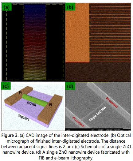 The ZnO nanowires for device fabrication were synthesized through a chemical vapor deposition process as explicated in our previous works. Briefly, ZnO nanowire growth resulted from the templated substrate (sapphire) due to vapor-liquid-solid (VLS) mechanism of nanowire growth at a temperature of 950°C. A single nanowire device was fabricated through extraction and manipulation of a nanowire from the ensemble of nanowires. This was accomplished by using micro-fabrication techniques of E-beam lithography and focused ion beam (FIB). First, inter-digitated electrodes on insulating sapphire substrates were made using E-beam lithography. The substrates were coated with 100 nm of positive resist (PMMA A2) at 4500 rpm for 45 seconds and were baked at 180°C for 90 seconds to make them adequate for the E-beam process. An inter-digitated pattern designed using CAD package with NPGS (Nanometer Pattern Generation System) was written on the resist-coated substrates. The exposed substrates were developed using 1:1 (v/v) solution of MIBK and acetone for 90 seconds. Subsequently, a 70 nm coating of gold was deposited followed by lift-off to complete fabrication of inter-digitated electrode. Thereafter, these substrates were introduced in a focused ion beam (FIB) system (FEI Quanta 3D Dual-beam) along with receptor-functionalized ZnO nanowires on sapphire substrates. A single ZnO nanowire was extracted from the ensemble of nanowires using an in-situ micromanipulator and laid across the inter-digitated electrode. Subsequently, the nanowire was welded at its extremities, where it overlaps the electrode, with platinum using the in-situ GIS (gas injection system) to complete fabrication of the device. Before extracting the single ZnO nanowire device from the FIB chamber, EDAX analysis of the exposed nanowire area was performed. This was done to identify any prospective contamination that might have happened as a result of subjecting the single nanowire to an intense device fabrication procedure. The multi-nanowire device fabrication utilized receptor-functionalized ZnO nanowire arrays on sapphire substrates. To fabricate these devices colloidal silver solution (Ted Pella, Inc.) in a volatile solvent was coated at the extremities of the receptor-functionalized nanowire substrates to function as electrodes. Silver was used to make an ohmic contact between functionalized ZnO nanowires and the electrode.