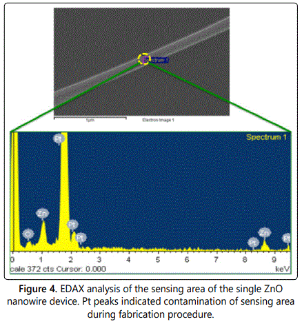 For fabricating a single nanowire device a receptor-functionalized ZnO nanowire was extracted from the ensemble of nanowires grown on the substrate using the micromanipulator in-situ the FIB system and was placed across the inter-digitated electrode. Figures 3a and 3b shows the E-beam mask design and the optical micrograph of the completed electrode, respectively. After successfully positioning the nanowire across the electrodes, platinum was deposited at its extremities to complete the fabrication of the device. Figure 3c exhibits the schematic of the single nanowire device while figure 3d shows the completed device. Before retrieving the finished nanowire device from the FIB system, EDAX analysis of the exposed nanowire area was performed. This was done to ensure the compositional integrity of the sensor device fabrication procedures. It was observed that the platinum deposited was not confined to the electrode area but also contaminated the sensing area resulting in unintentional doping. Figure 4 shows the EDAX spectrum of the selected area on the exposed functionalized nanowire surface. Platinum peaks can be clearly observed, which indicate its incorporation in the sensing area. Pertaining to such findings, the single functionalized ZnO nanowire device was evaluated to be unsuitable for p-nitrophenol sensor fabrication. Furthermore, electrical tests on these single ZnO nanowire devices yielded inconsistent, erratic results confirming unreliability and minimal signal-to-noise.
