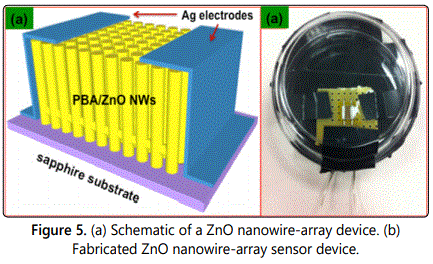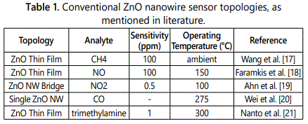 Among the numerous metal oxide nanomaterial systems, ZnO nanowires have been utilized continuously in different morphologies and topologies to fabricate sensitive detection systems for simple analytes, such as carbon monoxide (CO), NH3, NO2, and humidity (H2O). It is, therefore, befitting at this juncture to highlight some pertinent empirical reports in this area. Wang et al. utilized single ZnO nanowire sensors, fabricated with MEMS technology, for detecting ppm levels of ethanol vapors at 300°C [14]. Similarly, Fan et al. developed a ZnO nanowire field-effect sensor to detect NO2 and NH3 [15]. They observed that the gate potential was related to the device sensitivity and that desorption of analyte molecules from nanowire surface was facilitated by applying a large negative gate bias. This provides an additional pathway for refreshing ZnO nanowire-based sensors. In contrast, Yang et al. used UV properties of ZnO nanowires for developing chemical gas sensors [16].