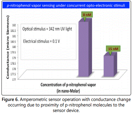 The electrical properties of the multi-nanowire devices were measured using a semiconductor parameter analyzer (Agilent Technologies). I-V curves of both pristine and receptor-functionalized ZnO nanowire array devices were measured. It is to be noted that device testing of single ZnO nanowires was not pursued due to alteration of chemical composition of the device due to unavoidable contamination resulting from the device fabrication procedure. This will be discussed in the forthcoming section. Subsequent to preliminary testing of the functionalized multi-nanowire device, an additional optical stimulus from a 342 nm UV lamp was provided to test for opto-electronic sensing behaviour of the device. Current was then measured from the device under a bias of 0.1V. Subsequently, the device chamber was allowed to saturate from p-nitrophenol vapors by introducing a few milligrams of the solid powder. Current was then measured from this device after 5 minutes to validate the sensing behavior of the device. The test assembly to establish sensor operation is illustrated in figure 2. The benefit of this assembly is that it permits transduction of optical response from the sensor to an amperometric signal, which makes it easier to measure with conventional electronics without the use of sophisticated optical detectors. However, utilizing sophisticated optical detection and transduction electronics will only serve to improve the sensitivity and selectivity of the device in addition to minimal false positive rate.
