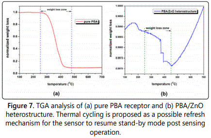 To investigate the reliability of this device further, the sensing chip was subjected to thermogravimetric analysis (TGA) to determine the breakdown temperature of the PBA/ZnO heterostructure. The opto-electronic sensor operation of the multi-nanowire array device is contingent upon chemical integrity of the heterostructure. Therefore, the advantages of using TGA are two-fold. First, it aids in determination of the temperature range, where the PBA receptor coating would be stable on ZnO nanowire surface. This would serve as a measure to qualitatively determine the robustness of the device under field conditions, since the sensor could be subjected to a varied temperature regime while being deployed on the field. Second, it would allow for identification of a prospective strategy to reset the device. Figure 7a shows the TGA spectrum of pure PBA receptor. It can be observed that in the temperature range of 250-450°C the sample exhibited maximum weight loss, which indicated the decomposition of PBA receptor. This means that the sensor operation limit is less than 250°C. Figure 7b shows a TGA spectrum of PBA-functionalized ZnO nanowire sensors. The maximum weight loss in the sensing chip happened in the range of 250-450°C indicating breakdown of the chemisorped organic layer of PBA on ZnO nanowire surface. This complies with the data for pure PBA decomposition in figure 7a. The data was normalized to minimize the effect of instrument drift. It was especially useful for the analysis of PBA/ZnO heterostructure, where subtle weight changes in the sub-milligram range could be observed. However, drift at large temperatures became large and could not be removed even with normalization.