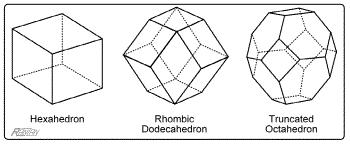 It should be mentioned that the Voronoi argument/ principle is of limited use: The dynamic processes that sustain fluid (or fluid-like fine particulates) cells invariably produce hexagons (in the case of surface-type cells), in accordance with the principle of Voronoi cells. But in the case of 3-dimensional spatial cells the Voronoi principle is less predictive —it allows for both the rhombic dodecahedron and the truncated octahedron. Moreover, the experimental result (described earlier) of compressing spherical lead pellets or of just imagining the outcome of compressing a collection of balloons so that the interstitial spaces/gaps become greatly reduced so that those in-between gaps are eliminated, those experiments can give mixed results. If initially the spheres are systematically closest-packed, the results favor the dodecahedron. But real cosmic cells were never spheres and so a deformational transition to a polyhedron never arises.