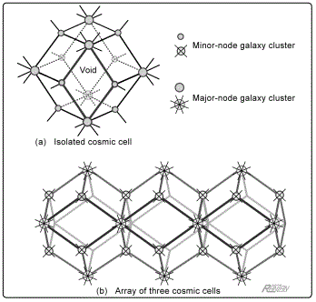 Figure 2. Typical cosmic structural cell, schematic (a), has two distinctly patterned vertices or nodes. Within an extended tessellation these nodes are configured as four-armed and eight-armed nodes. Schematic (b) shows a portion of a multiple ‘packing.’ Interestingly, although an individual cosmic cell has 8 minor and 6 major nodes, within an extended tessellation there are actually twice as many Minor nodes as Major nodes.