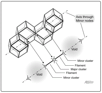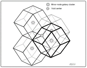 And then there is the evidence provided by the established existence of two sizes of clusters. Theory predicts two sizes of mass aggregations (galaxy clusters). And indeed, that is precisely what has been found; galaxy clusters come in basically two distinct sizes. As described earlier, this size classification corresponds to the two types of vertices present in the geometry. There are two distinct nodes (4-branched and 8-branched). This is extremely important —it is a feature not shared by the Cube, or by the Truncated Octahedron.