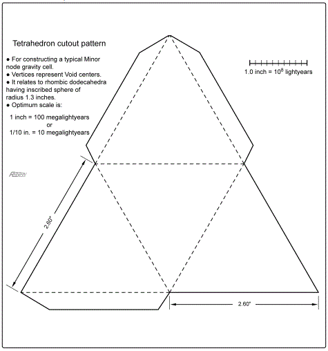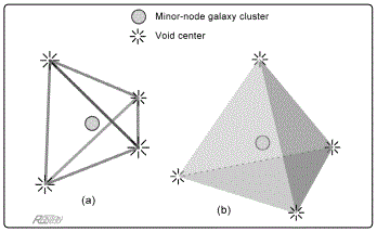 Consider a Minor node (see Figures 2 and 3): it is surrounded by four gravity concentrations (its four nearest neighboring galaxy clusters). The directions of these four are indicated by the dodecahedral geometry. (Idealized, the directions are symmetrical.) According to the Voronoi principle, located somewhere between each of the Minor node’s four neighbors, there is an imaginary plane dividing/ separating respective gravity domains. There are four such planes; they obviously form the boundary faces of a tetrahedron. And the vertices of the tetrahedron mark the locations of Void centers. It is simple, basic geometry.