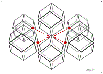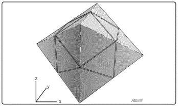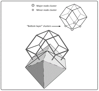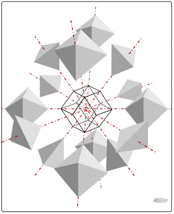 2.2. Octahedral cell Next, consider a typical Major node. It is surrounded by 6 structural units —six close-packed dodecahedra. Figure 5 shows a 'touching' pair, one above the other, surrounded by the pair's four closest neighbors (but detached for the sake of clarity). Again, the gravitational influence of the node's galaxy cluster extends as far as the surrounding void centers, of which this time there are six. In terms of the physical cosmic tessellation, an 8-armed galaxy cluster is always surrounded by 6 Voids, similarly arranged.