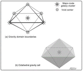 The gravity domain of a Major node is then defined by the galaxies at the center and the six surrounding void centers (again, ideally symmetrically positioned). Joining the void centers, as shown in Figure 6, reveals an octahedral-shaped gravity cell.