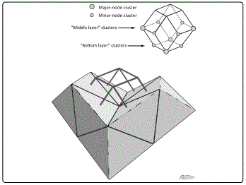 Figure 5. Schematic of a cosmic-structural-cell grouping as a guide in determining the shape of the gravity domain for a typical Major node galaxy cluster. In terms of the geometry, the Major node is surrounded by six close-packed dodecahedral cells. In terms of the astronomically observable structures, the associated nodal galaxy cluster is surrounded by 6 Voids. Shown here is a ‘touching’ pair of structural cells, one above the other, surrounded by the pair’s four closest neighbors (but detached for the clarity).