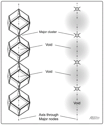 Figure 12. Characteristic pattern found in a close-packing of dodecahedral cosmic cells. The line of sight through opposite Major nodes, as shown here schematically, encounters an alternating sequence of Major galaxy clusters and great Voids. (For the sake of clarity, the surrounding units of the packing have been omitted.) The evidence for this kind of pattern can be found in the Abell-85 system of galaxy clusters.