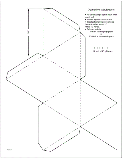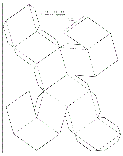 Note, In order for the cardboard models to reflect a realistic scaling (that is, for them to correspond to the probable nominal diameter of 300 mega lightyears of the Universe’s structural dodecahedral cells), the images must be enlarged when printing so that the included one-inch-scale mark will actually measure 1 inch along a physical ruler. In other words, when printing the “cutout”, adjust the printer using the “scaling” printing option with an appropriate setting. (This makes the functional scale 1 inch equals 100 mega lightyears.)