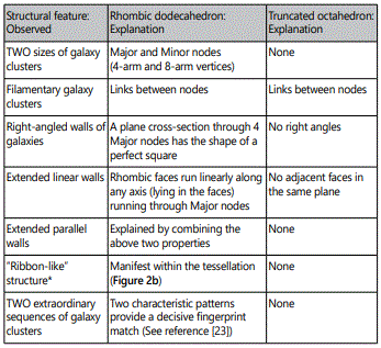 Table 1. Comparison of the two candidate shapes as they relate to cosmic-scale observations. When it comes to explaining cosmic structural features, a network of dodecahedra trumps a network of truncated octahedra.