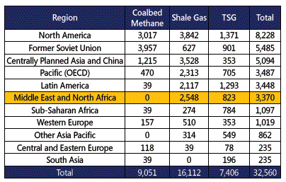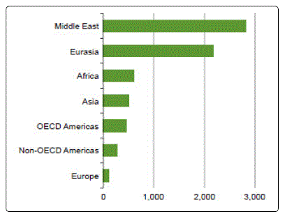 Figure 1. World Proved Natural Gas Reserves by Region as of January 1, 2016 (trillion cubic feet: Tcf)