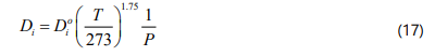 The diffusion coefficient of component i (Di°) at 0°C and 1 atm is given by:
