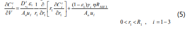 Where Ci is the concentration of component i, Ao is x-sectional area of the bed, ul is the axial velocity, e1 is porosity of the bed, Dei effective diffusivity coefficient of component i, gi is the generalized stiochiometric coefficient of component i (negative for reactants) and h is the effectiveness factor.