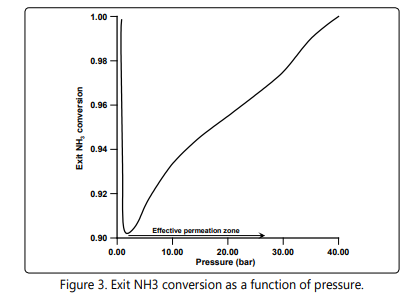Figure 3 shows the effect of the pressure on the exit ammonia conversion for the MSFBMR configuration. At a low pressure each bed of the MSFBMR configuration works similar to a fixed bed reactor due to virtually weak hydrogen permeation. It is clearly shown that, the exit ammonia conversion decreases with the increase of the pressure due to its negative influence on the thermodynamic equilibrium to a critical inflection point beyond which the role of the membrane comes to dominate and developing an effective permeation zone. Note that this critical point needs to be identified to determine the critical minimum operating pressure for the MSFBMR configuration.