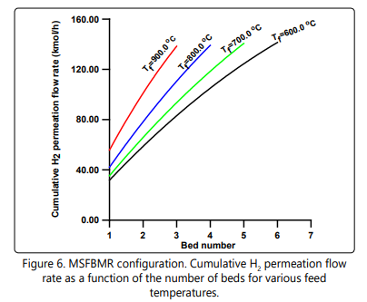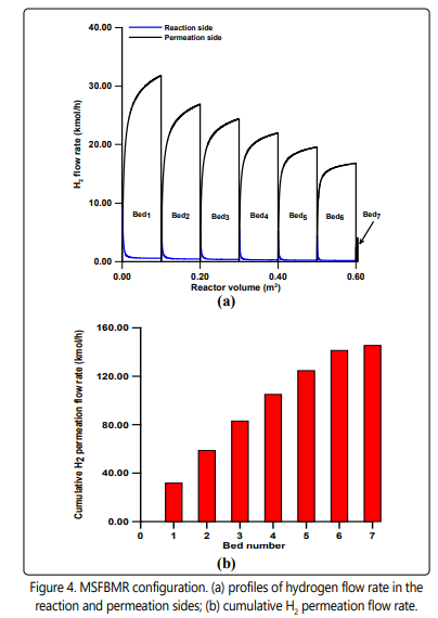 Figure 4a shows the hydrogen molar flow rate in the reaction and permeation sides for the MSFBMR configuration. As it can be shown that the hydrogen permeation is high in the first bed and decreases progressively to the last bed, this could be due to the availability of the hydrogen in the reaction side. The cumulative hydrogen flow rate in the permeation side is presented in Figure 4b. The result is consistent with the results shown in Figure 4a and implies progressive increase in the cumulative hydrogen flow rate.