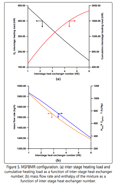 Figure 5a shows inter-stage heat load per heat exchanger (Qj ) and cumulative inter-stage heat load (ΣQ). It is shown clearly that the inter-stage heat load seems to decrease linearly with the increase of the number of heat exchangers due to the decrease of the mixture mass flow rate and the enthalpy as a result of hydrogen permeation as shown in Figure 5b.