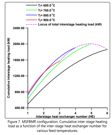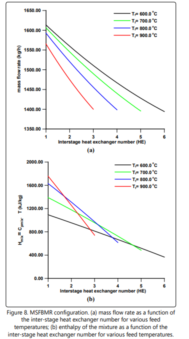 Figure 6 shows the cumulative hydrogen permeation flow rate as a function of the number of beds for various feed temperatures. Note that all the feed temperatures give almost the same final total quantity of permeating hydrogen independent of the number of beds used. The corresponding cumulative interstage heating load is depicted in Figure 7. It is interesting to note that the total inter-stage heating load at the Tf = 900°C is the least compared to other feed temperatures in spite of the fact that it has the highest temperature drop per heat exchanger as clearly shown in Figure 2 (Tf = 600°C ). Also, in Figure 7 one can see that the locus of the total inter-stage heating load assumes an inflection point of maximum nature. This phenomenon might be due to the complex interaction of the hydrogen permeation, heat capacity, temperature drop and the number of beds. Figures. 8 a and b might help us to have some understanding of this phenomenon. Figure 8a shows that the mass flow rate decreases along the heat exchangers due to separation of hydrogen. Also, the mass flow rate decreases as the feed temperature increases from 600°C to 900°C. This is could be due to the fact that a high feed temperature has a profound positive effect on the ammonia decomposition kinetics and its thermodynamic equilibrium. At the first heat exchanger the enthalpy of the mixture increases as the feed temperature increases from 600°C to 900°C as shown in Figure 8 b. The result of an overall effect is that the heat load increases as the feed temperature increases as shown in Figure 7. However, this sequence of events does not remain after the first heat exchanger. As the number of heat exchangers increases after the first heat exchanger, the final exit enthalpy of the mixture decreases as the feed temperature decreases opposing the trend of the mass flow rate as shown in Figures 8 a and b. This is the main reason for the formation of the maximum shown in Figure 7. The data for numerical simulation are listed in Table 1.