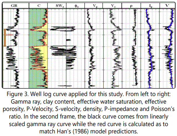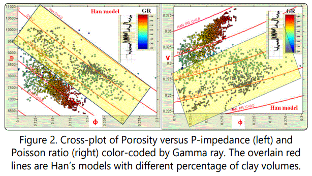 With respect to rock physics modeling of reservoir properties, Han et al. (1986) model was found to fits the data utilized herein. Hanʼs model was used to estimate the clay content which was referred to as model based Clay content. This work also realized that model based clay content gives better results than a linear GR based clay content when computing model based acoustic impedance.
