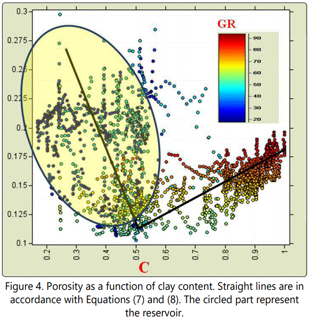 The concept proposed by [20] was applied here in order to establish the desired link. (Figure 4) shows the cross-plot of ϕ versus the model based C in which it can be observed that ϕ is relatively large but experiences a decrease as the value of C increases in the clean sand. This trend shows a turning point at C = 0.5, where the transition from sand to shale occurs thereby making a V-shaped pattern. This V-shape pattern is a characteristic of a bimodal sand/shaly mixture [15,21].