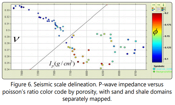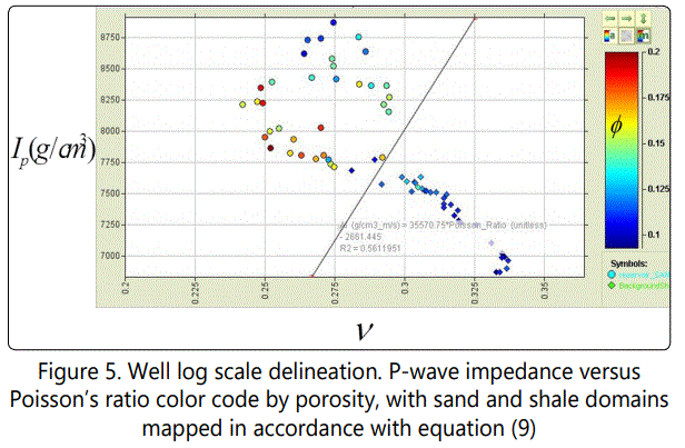 If Ip<3550.75ν-2661.45, the zone is considered as sand and if Ip≥3550.75ν-2661.45, the zone is considered a shale zone. This Cut-off value is apparently valid with log data. Is this cutoff value going to be the same on a seismic scale? To answer this question, a cross plot of an upscaled Ip and ν logs was carried out, in which similar trend with the well log scale model is observable. This has shown that the chosen cut off value is valid for reservoir delineation (Figure 6).