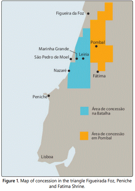 In September 2015, the Government and the Australis Oil and Gas Company signed the contract for research and production of oil in the triangle formed by Figueira da Foz, Peniche and Fatima Shrine. The municipalities of Pombal, Soure, Leiria, Marinha Grande, Batalha, Nazaré, Alcobaça, Porto de Mós, Caldas da Rainha, Ourem and Rio Maior are of interest to the oil and gas exploration. It is allowed for eight years and anticipated an investment of 10,225 million euros and if there is production, the operating contract is for 25 years, with extensions up to 15 years. These holdings comprise several lots of contiguous land and cover the district of Coimbra, Leiria and Santarem between the Mondego estuary, by the municipality of Ourém to Fatima Sanctuary and inclusive. The contracts provide that Portugal will receive royalties (exploitation rights) in the total amount of 1,5 to 8% of the total withdrawn barrels, but there is a clause that conditions the payment: Only when the Australis company find the concession investment was recovered [21].