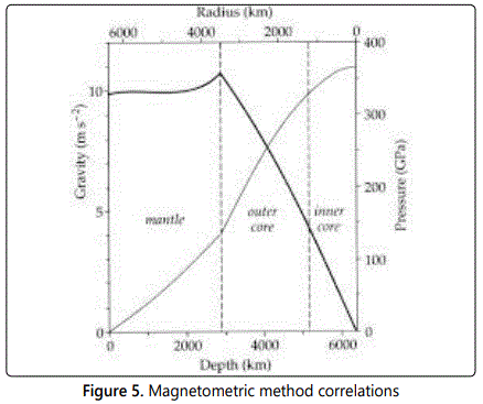 The unit of measure in magnetic surveys is the gamma, or nanotesla, that is worth 10-5 gauss, unit defined in homage to the German mathematician Karl F Gauss (1777-1855). The Earthʼs magnetic field is of the order of 50,000 gammas and the anomalies of interest in the prospecting of oil are of the order of 1 to 10 gammas. The magnetometers must have a sensitivity of 1 / 50,000 [5]. The Magnetometric method is shown in (Figure 5) [5].