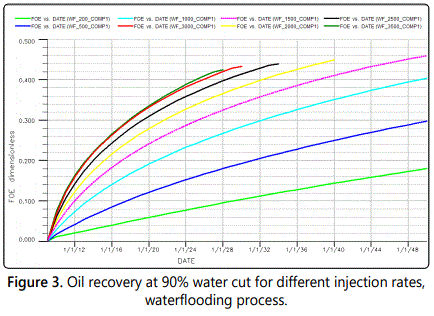 According to what has been found, the maximum oil recovery was achieved at an injection rate of 1500 STB/D, with 1.05% difference from the base case injection rate (2000 STB/D). Injection rate of 200 and 500 STB/D are considered to be too low and they delay the breakthrough with bad recovery compared to other injection rates. Fast breakthrough was observed at 2000 STB/D and at higher injection rates as shown in recovery profile at 90% water cut using different injection rate as in figure 3. Thus, 1500 STB/D was considered the most suitable operating injection rate for this study.
