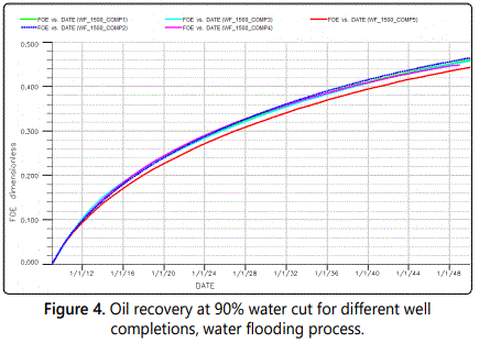 Continuous polymer injection: A total of fifteen runs were simulated where figure 5 shows the oil recovery obtained for different polymer concentrations corresponding to the three completions attempted.