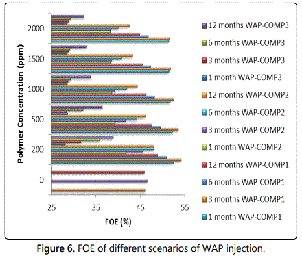 The effect of injecting different pore volumes of water followed by the same pore volume of polymer solution (WAP ratio 1:1) including 0.00235, 0.00704, 0.014, and 0.0285 where each denotes that both slugs (water and polymer solution) will last for one, three, six, and twelve months respectively, keeping both the polymer concentration and the selected completion constant is significant. A summary of the FOE results is illustrated in figure 6. From the results presented, the following points can be deduced: