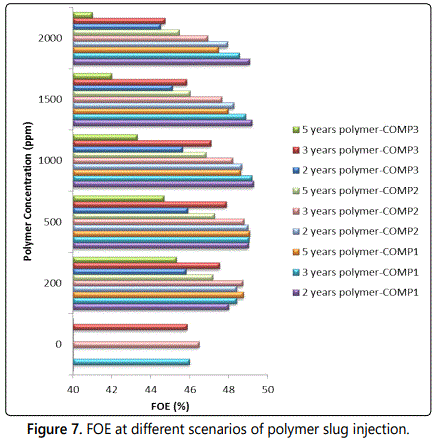 A comparison between the different options attempted as polymer slug injection is presented in figure 7 in terms of FOE versus different polymer concentrations ranging between 200 and 2000 ppm, for the three well completions investigated, and polymer injection period (different PV).