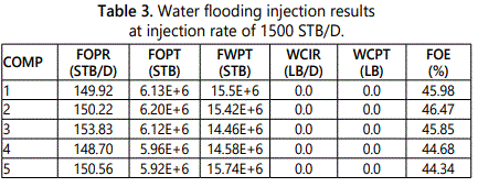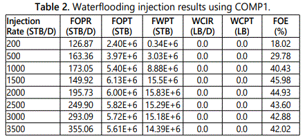 Injection rate sensitivity analysis: The base case completion (COMP1) was set for all runs to study the effect of various injection rates on the performance of the water flood where 2000 STB/D is the base case injection rate.