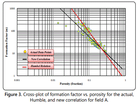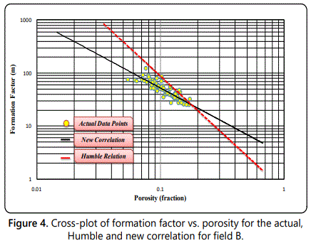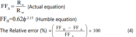 The values of internal geometry factor and cementation exponent are affected by many factors such as sorting, shape and packing of the system, pore size, tortuosity, and type of pore system (intergranular, intercyrstalline, vugy, fractured), compaction and clay content. These factors are varying from formation to another. This indicates that using Humble equation will give a large error in determining the formation the resistivity factor, which will lead to an error in the determining of water saturation. While the using of our correlation showed a very good matching with the Actual data points as it can be seen in Figures (3& 4).