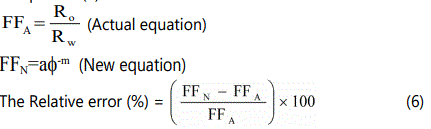 Where it was obtained by the measurements performed in 29 samples of North American sandstones. These core samples are consolidated sandstone sample. The internal geometry factor (a) and the cementation factor (m) define the characteristic properties of the formation, therefore are determined for individual formation. The parameters, (a) and (m) cannot be defined uniquely for a formation if there are too few porosity data available or the porosity range is too narrow. The average relative error mentioned in table2 for two fields A, and B are supports above concluded fact. We can note from the table that the average error by using Humble equation was high compared to the average error using derived correlations.