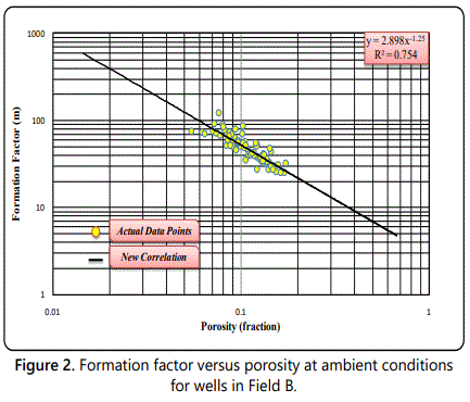 In field B, eighty-two representative sandstone core samples used had porosities between 5.45 % and 17.31 %. The samples were selected from depth intervals (13877 ft-13969 ft). The porosity, formation resistivity factor and cementation exponent of these samples at ambient conditions were measured and displayed in figure 2. The figure shows the formation resistivity factor versus porosity measured at ambient conditions. In the measured cores a well-defined relationship exists between formation resistivity factor and porosity. The cementation factor (m) was calculated for each sample. The average cementation factor for all core samples was calculated from the slope of the best fit straight line through the points and was found to be 1.25 and the correlation coefficient R2 was 0.75. The following equation represents the relation between formation resistivity factor (FF) and porosity (ø):
