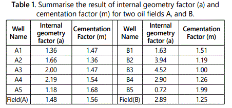 It was observed from the result in Table 1 that the cementation factor for most of the wells varying between 1.0-1.99. A slight difference of cementation factor between field A&B were noticed which is approximately (0.31), this indicating that field- A has slightly greater cemented materials than field B. There is also difference in formation water salinity between the two fields where field A has a salinity of 154,000 ppm and field -B equal 121,000 ppm. This difference in salinity affects the formation resistivity factor and consequently cementation factor, because the formation factor depends on many parameters such as porosity, packing, sorting, pore size distribution, and irreducible water saturation.