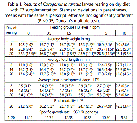 The aim of the experiment was: 1) to test the effect of a dry diet supplemented with 3,5,3ʼ triiodothyronine on larval rearing, and 2) to designate the best level of the hormone supplementation in coregonid starter diet.