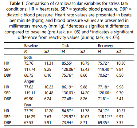 Fear and anger are central to the “flight-or-fight” stress response, respectively, and are generated by distinct aspects of the nervous and endocrine systems [13].Further, researchers have found evidence for cardiovascular response specificity for fear and anger [14, 15]. Contemporary constructionist models of emotion may help explain the response specificity finding. Constructionist models conceptualize emotions as existing along three dimensions: valence, arousal, and dominance [16, 17].Along these dimensions, fear is associated with negative valence, high arousal, and low dominance (i.e., submissiveness) and anger is associated with negative valence, high arousal, and high dominance [16, 18]. Differences in the dimension of dominance, in turn, may result in distinct behaviors, responses, and experiences [14, 15].