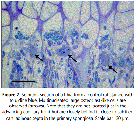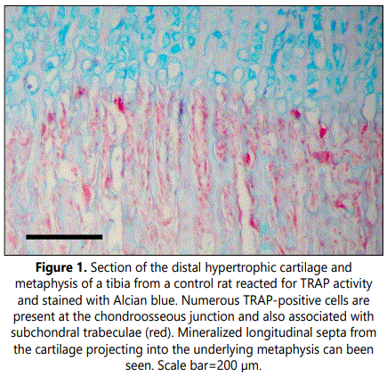 An essential process for endochondral ossification is the controlled degradation of the cartilage to allow deposition of bone matrix by osteoblasts [4]. Multi-nucleated cells resembling osteoclast-like giant cells are present at the chondroosseous junction associated with the tips of in growing capillary sprouts. The invasion of the ossification front requires an extensive but selective degradation of cartilage matrix. Terminal transverse septum of growth plate cartilage are degraded to allow capillaries to bud into the lower hypertrophic zone but the vertical walls that divide the chondrocyte columns are preserved and form the longitudinal mineralized cartilage septa that comprise the substrate onto which osteoblasts deposit the bone of the primary spongiosa. Thus, an accurate matrix degradation is necessary for the formation of the primary bone trabeculae. Because of their evident role in cartilage resorption, multinucleated cells at chondroosseous junction are named for some authors chondroclasts although other consider them as osteoclasts since they express cellular markers of the osteoclast-like phenotype, like TRAP+, cathepsin K+, MMP9+, CD14-,CD51+, HLA-DR-, CD45+, and CD68+ [5].