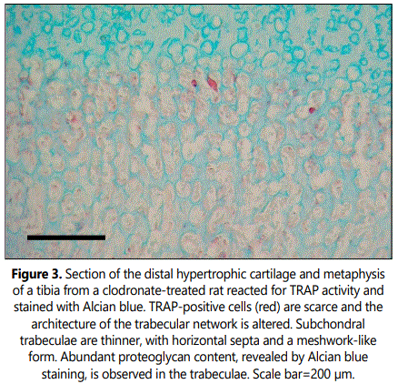 The bisphosphonates are a class of chemicals that strongly inhibit osteoclast-mediated bone resorption and are effective for preventing and treating skeletal disorders associated with hyper resorption and bone loss. Overall, these drugs have been used for treatment of bone disorders in adults and have shown to have a strong safety and tolerability profile [6]. The use of bisphosphonate therapy in the pediatric population was introduced in 1998 to treat children with severe osteogenesis imperfecta and resulted in reduction in bone resorption, increase in bone density, and reduction in fracture incidence [7]. These drugs were subsequently considered for treatment of other pathologies like steroid-induced osteoporosis and hypercalciuria. As bone in children is a growing tissue their effect could be different from adults. Due to their inhibitory effect on osteoclast activity, these drugs could affect the function of chondroclasts at chondro-osseous junction and could interfere with cartilage resorption and the formation of the first trabecular structures at the primary spongiosa. In this way, it is known that treatment with bisphosphonates gives rise to transverse radiopaque lines in the metaphyseal or diaphyseal part of long bones that are considered as a trace of a temporary bone growth arrest [7]. Furthermore, it has been reported that some compounds closely related to clodronate are avidly taken up in the region of the growth plate where cartilage is being replaced by bone [8]. Thus, it could be considered that bisphosphonate treatment could affect normal growth plate function. However, most of the studies on these drugs have been performed on adults and their effect on growth plate activity are little known since most studies of the effects of bisphosphonates on long bones are limited to traditional radiography [9].